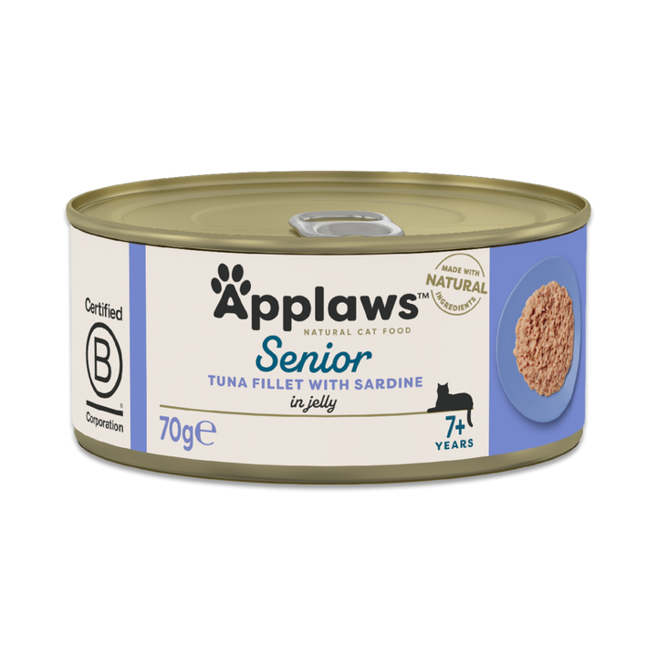 Applaws Senior Tun og sardiner i gele til ældre katte. Naturligt premium tilskudsfoder, som består af første klasses ingredienser og indeholder protein af høj kvalitet. Kan også anvendes til neutraliserede katte.